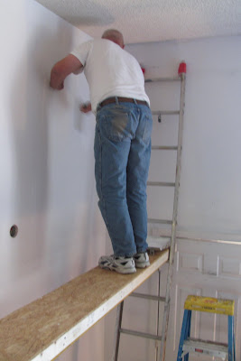 It all started because I said that we needed new carpet. Then we decided to paint before we got new carpet. So we spent our "weekend" painting. Today we got all the living room, hallway and entrance way done. Tomorrow we will do the trim work and put everything back. I know it looks like Gary is doing most of the painting, but really we both worked hard. He would do the cutting in and I would follow with the roller. We even had offers from Elise & Corinna to help today but we passed on that idea. We painted the two tone tan a solid tan, and the white walls we left white, so it really doesn't look much different, just clean and fresh.